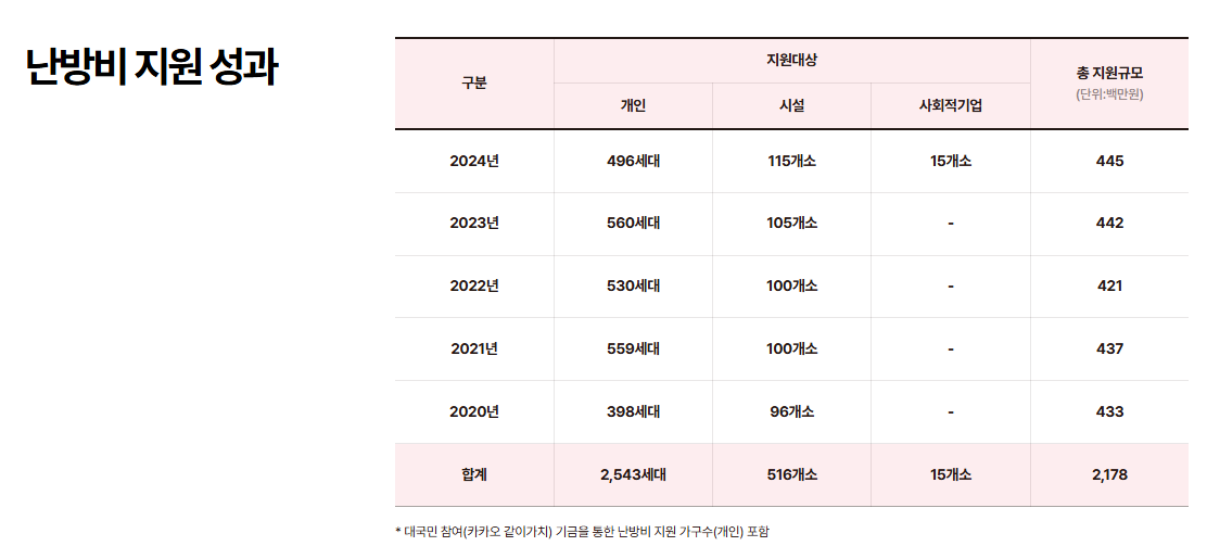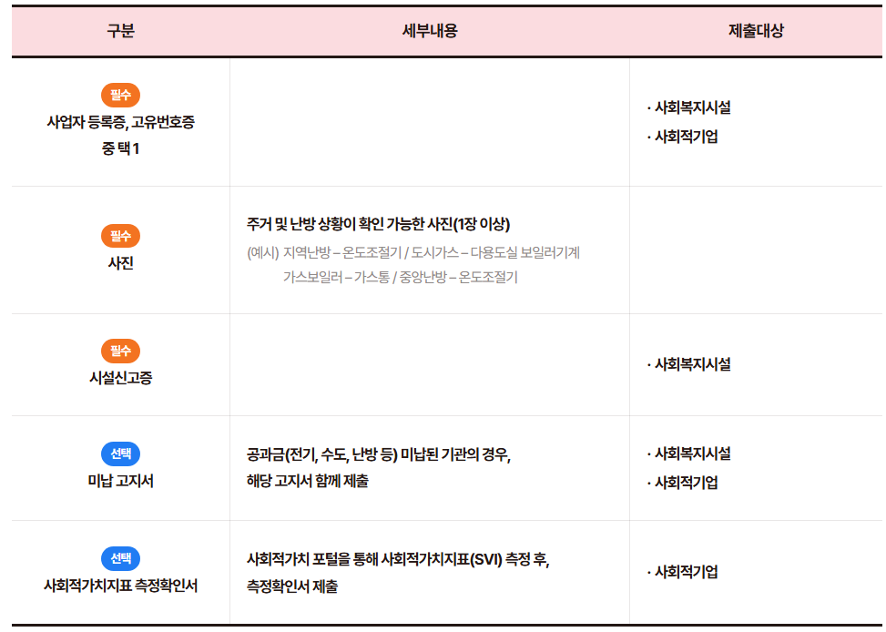 - 개인 가구(저소득·에너지 취약계층): 기초생활수급자, 차상위, 독거노인 등 겨울 난방비 마련이 어려운 가구 우선.