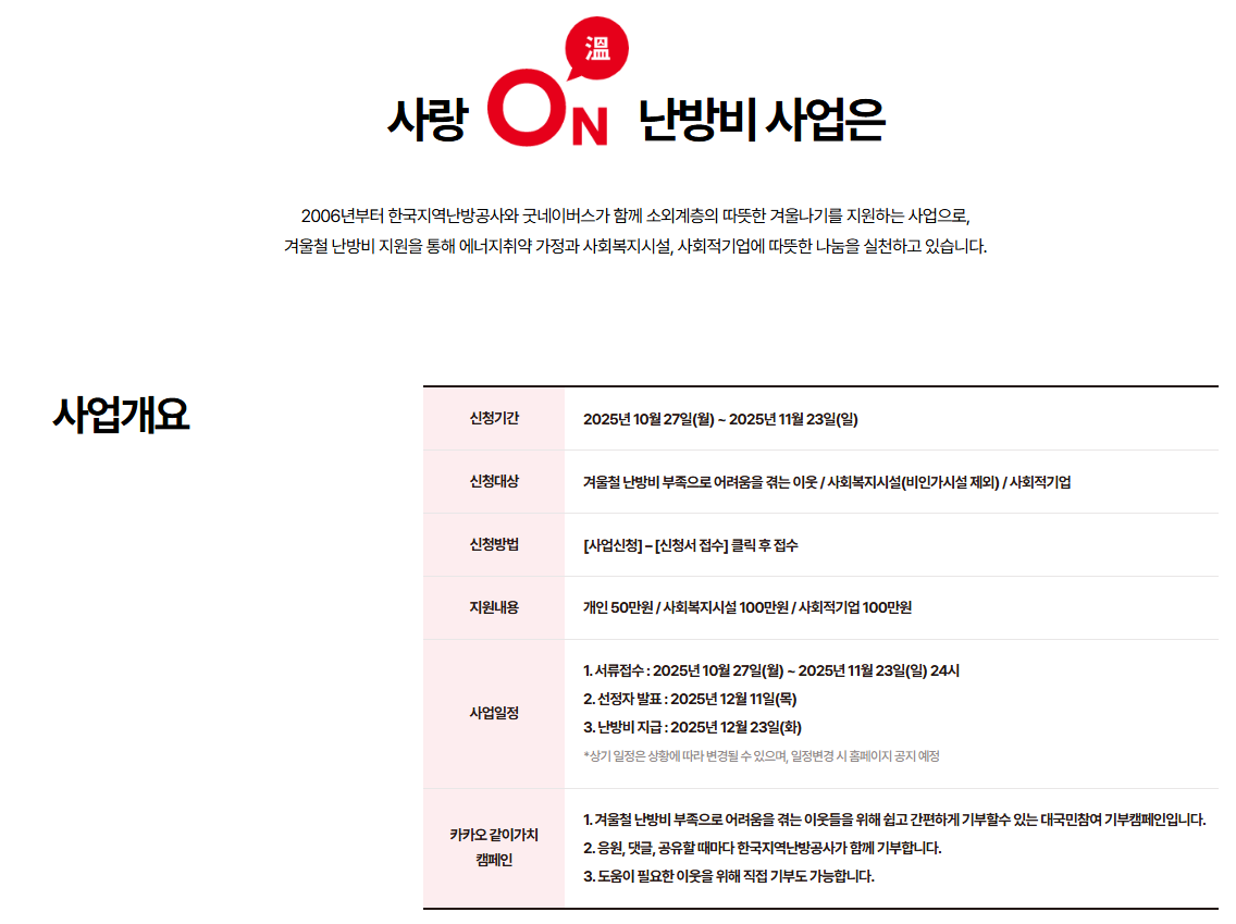사랑ON(溫) 난방비는 한국지역난방공사가 굿네이버스 등 파트너와 함께 진행해 온 겨울철 에너지 취약계층 난방비 지원사업의 브랜드(프로그램)입니다. 연도마다 명칭(예: 사랑의 난방비 → 희망ON → 사랑ON 등)이 일부 변경되기도 하지만, 목적은 동일하게 저소득 가구·사회복지시설·사회적기업의 난방비 부담 경감을 지원하는 사회공헌 사업입니다. 개인은 50만원, 사회복지시설(비인가시설 제외) 및 사회적기업은 100만원 까지 지원됩니다. 실제로 계좌릍 통해 현금으로 입금지원 ! (단, 전년도 지원금 지급 수혜자는 대상제외)