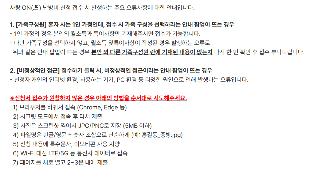 - 난방비 관련 증빙(등유 사용가구 등은 추가 자료 요구 가능)