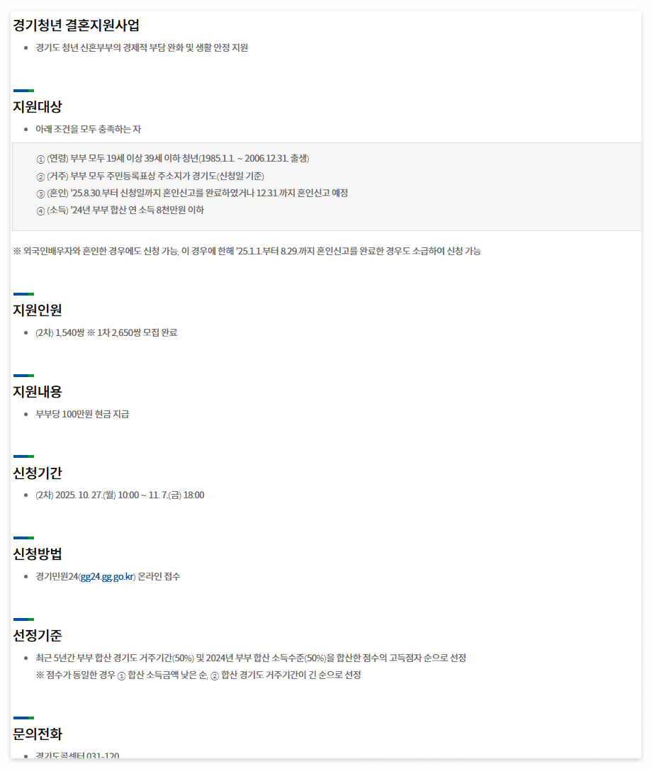 | 주요자격 | 부부 모두 19~39세, 부부 모두 경기도 주민등록, 2025.8.30 이후 혼인신고 또는 2025.12.31까지 혼인신고 예정, 2024년 부부 합산 연소득 8천만원 이하. |