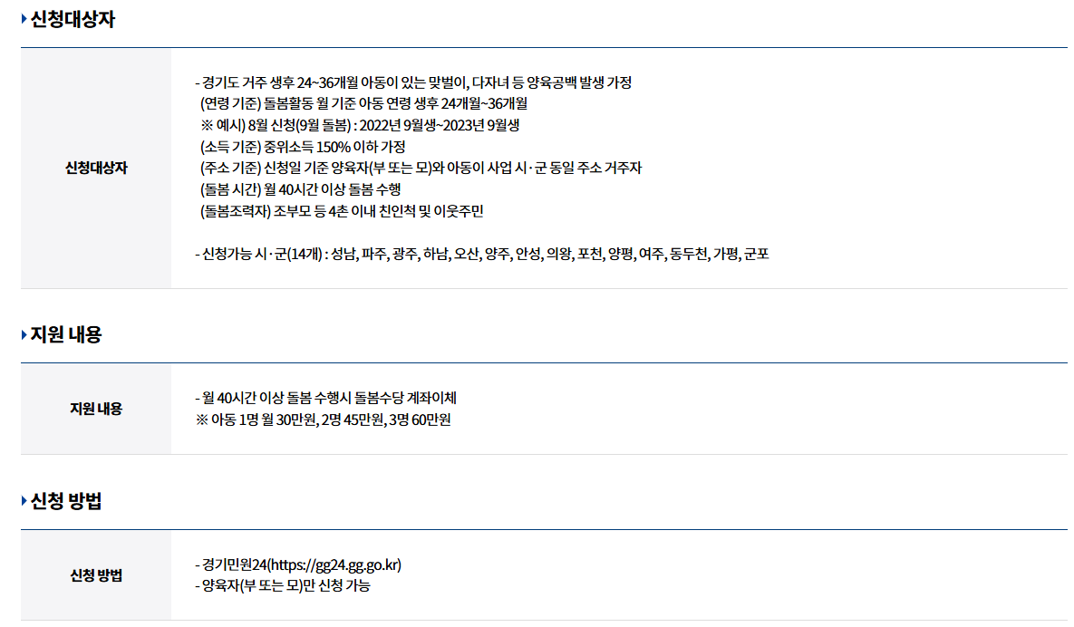 - 대상 아동 연령: 경기도 거주 생후 24개월 ~ 36개월인 아동이 있는 맞벌이, 다자녀 등 양육공백 발생 가정이 대상입니다.