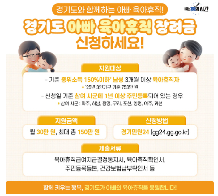 경기도 아빠 육아휴직 장려금은 아빠의 육아 참여를 장려하고 가정의 양육 부담을 줄이기 위해 경기도가 도입한 지역형 장려금입니다. 남성 근로자가 육아휴직을 사용하면 월 30만 원씩, 최대 5개월(총 150만 원)을 현금으로 지원하는 사업으로 2025년 일부 참여 시군에서 우선 시행되었습니다.