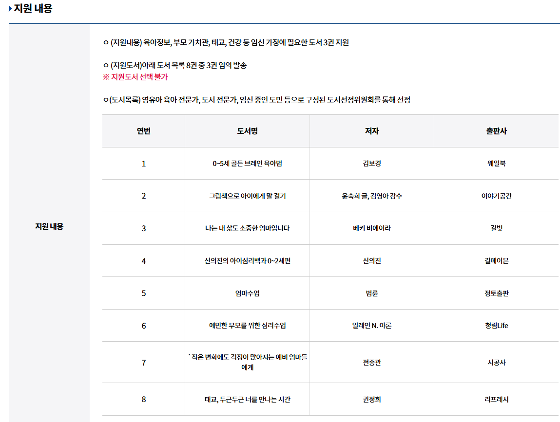 • 지원 내용: 태교·육아 정보, 부모 가치관 정립, 건강 관련 등 임신가정에 필요한 도서 3권을 무상으로 제공합니다. 도서 목록은 아래의 내용 확인 부탁드립니다. (도서는 지정 불가하며 3권 임의발송입니다.)