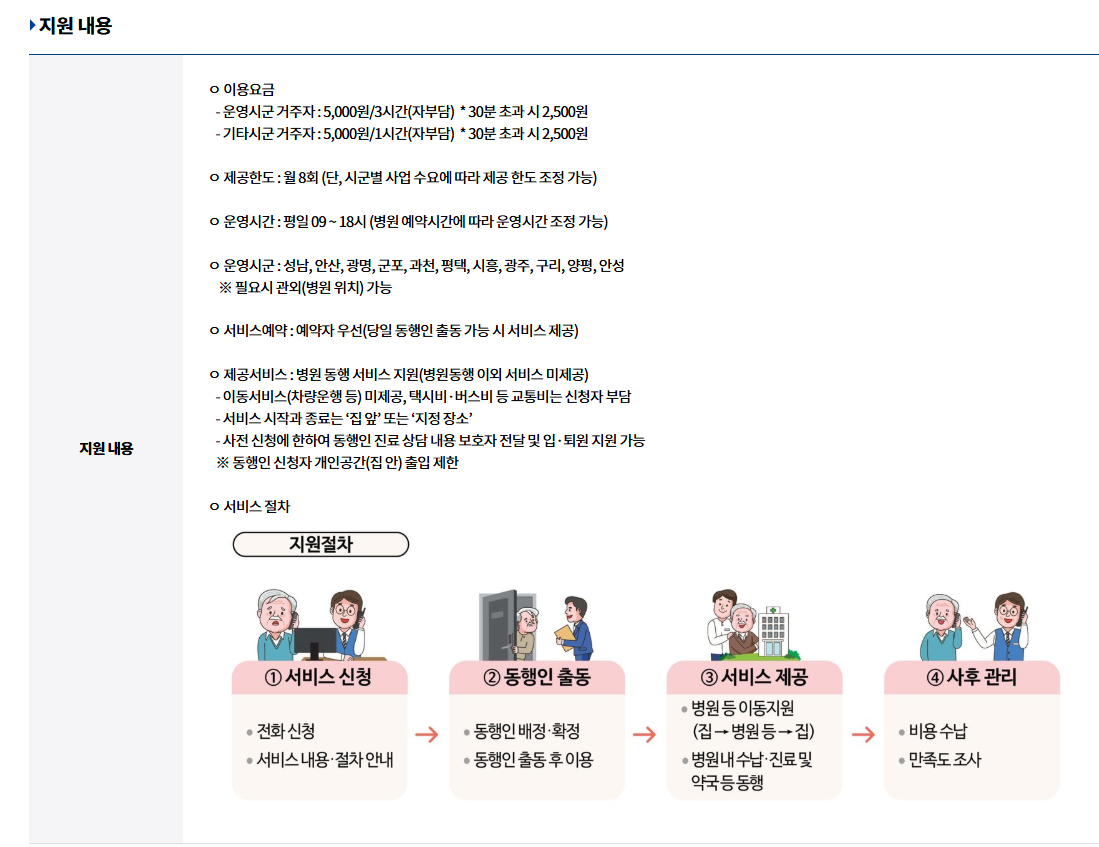 | 서비스 내용 | 집 또는 지정장소 → 병원 동행 → 진료·수납·귀가 지원 |