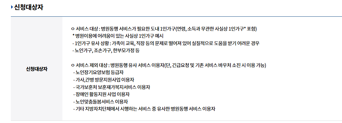 - 병원 동행 서비스가 필요한 도내 1인 가구 (연령·소득 무관) 혹은 실질적 1인 가구 : 가족이 교육·직장 등으로 떨어져 있어 실질적 도움을 받기 어려운 경우 포함.