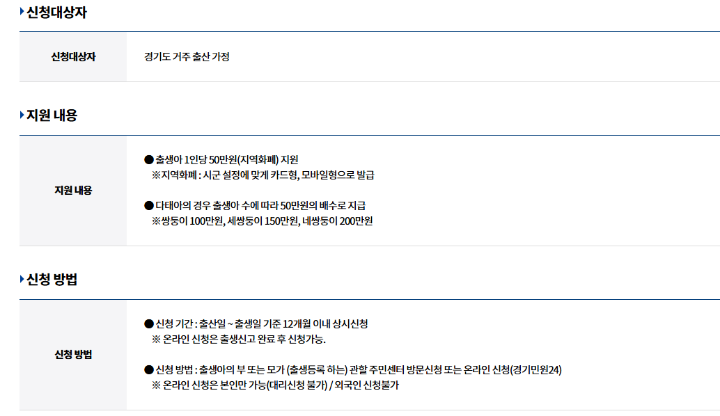 | 지원대상 | 경기도 거주(부 또는 모) 및 출생아 등록 등 조건 충족 시 |