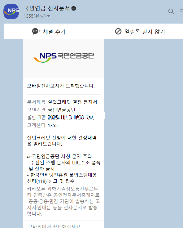 실업크레딧 자동이체 출금일이 다가오면 이렇게 카카오톡으로 전자고지서가 도착하고