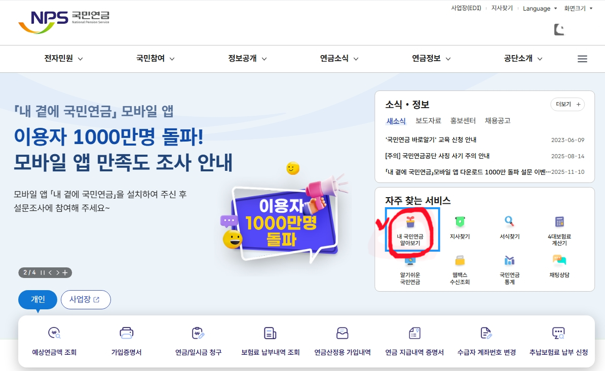 국민연금 사이트 -> 로그인 -> 내 국민연금 알아보기 클릭