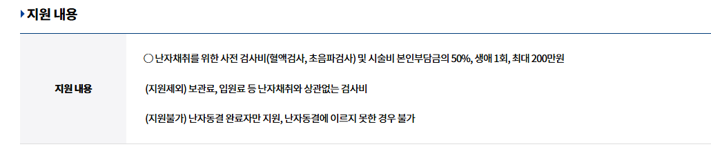 - 지원금: 최대 200만원, 시술비 본인부담금 50%