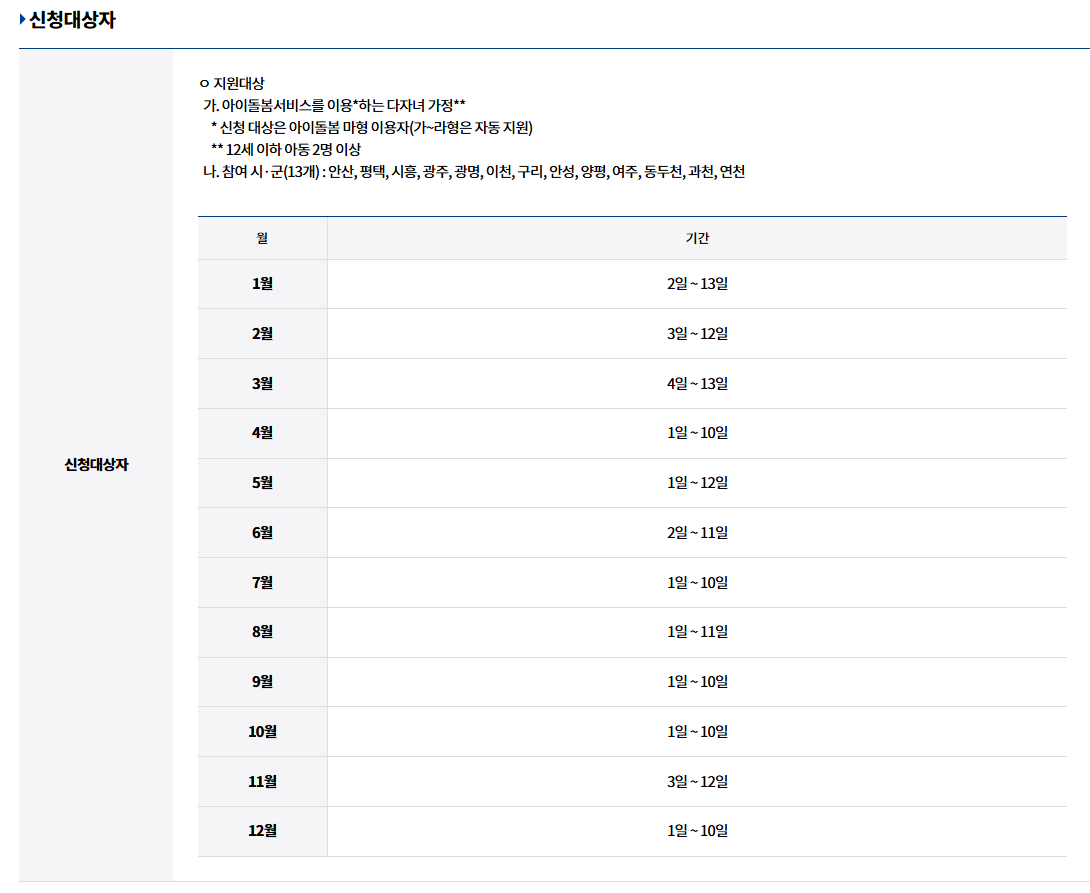 | 대상 가정 | 12세 이하 자녀 2명 이상, 아이돌봄서비스 이용 가정 |