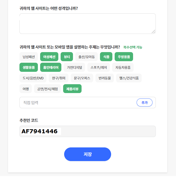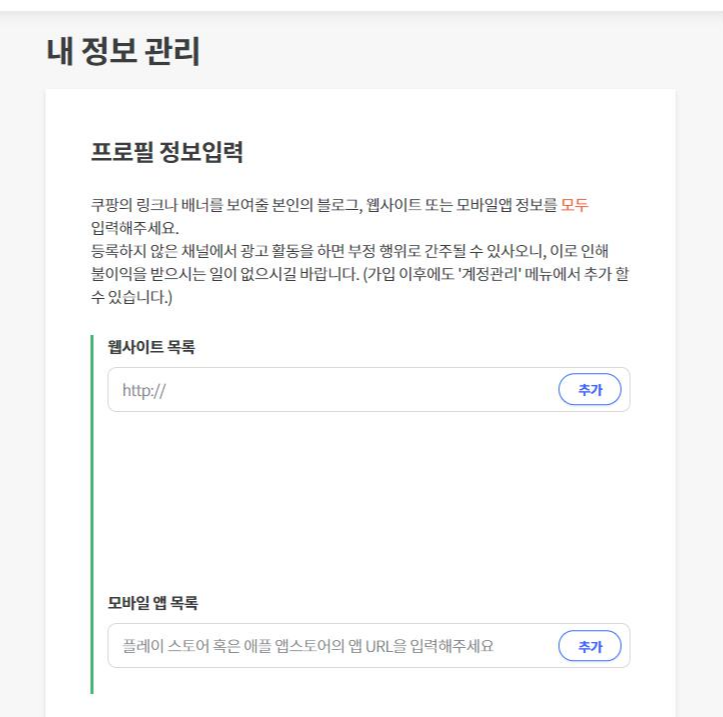 내가 배너를 게재할 사이트를 등록을 해야합니다. 등록하지 않은 채널에서 광고활동을 하게 될 경우 부정행위로 간주된다고 합니다. 이 점 꼭!! 유의해주세요.