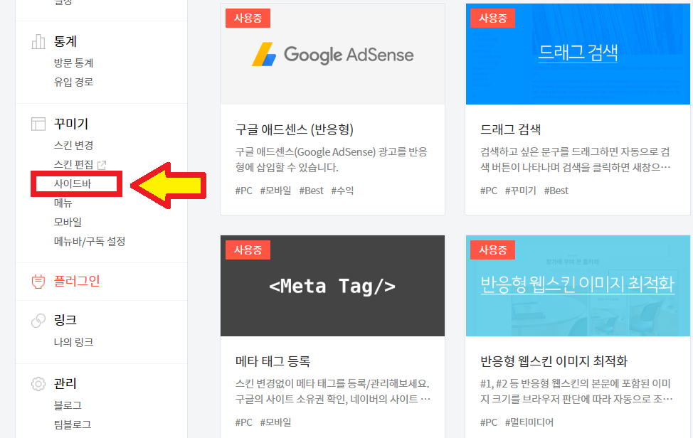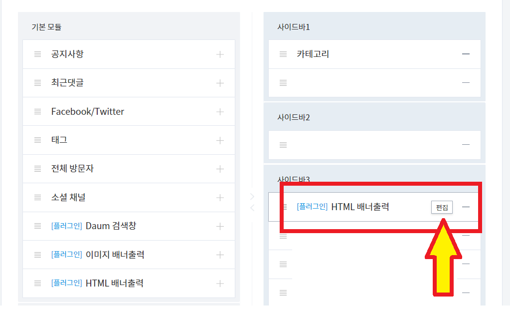 (스킨에 따라) 사이드바1, 사이드바2, 사이드바3 이라고 뜰 경우 본인이 원하는 위치에 하셔도 전혀 상관 없습니다.