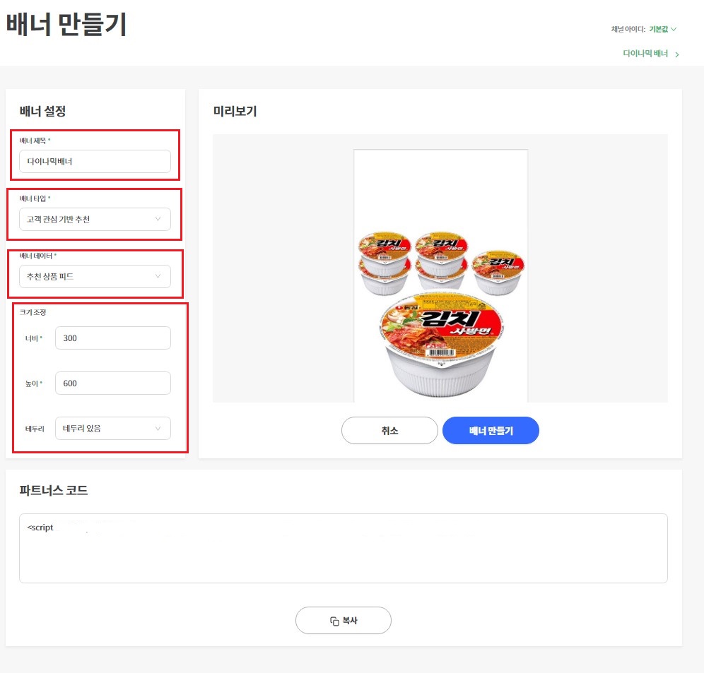 모두 설정하고 나서 <배너만들기>를 클릭하시면 하단에 [파트너스 코드]라고 코드가 생성됩니다.