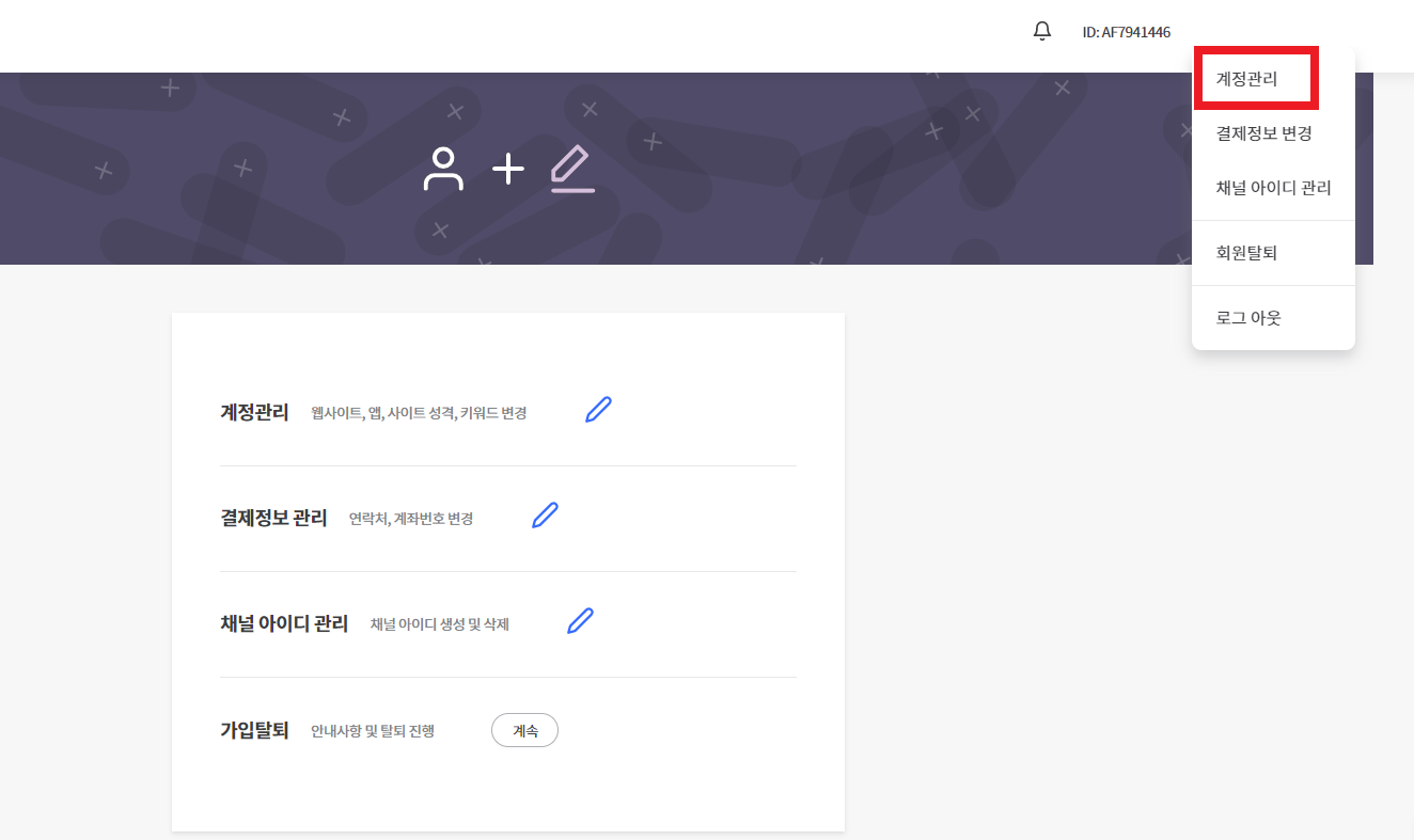 추가로 활동하실 웹사이트는 우측 상단 '계정관리'에서 추가하실 수 있습니다.