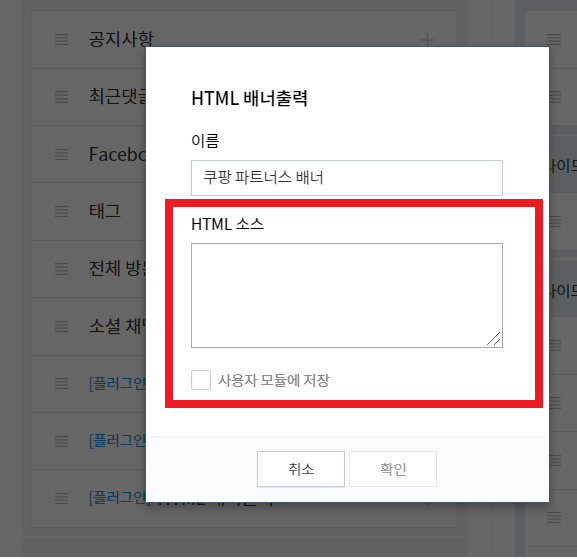 작성해주시면 되고, HTML소스 라고 되어있는 박스 부분에 아까전에 복사한 [쿠.파 코드]를 붙여넣기 해주시면 됩니다.