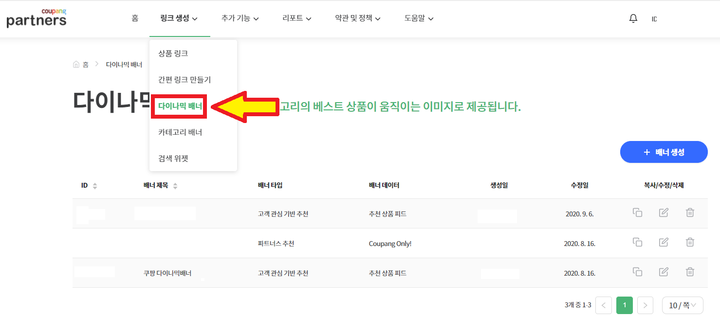 다만 이번 포스팅에서는 사이드바에 게재할 목적이기 때문에 [다이나믹 배너]로 만드시는 것을 권장드립니다.