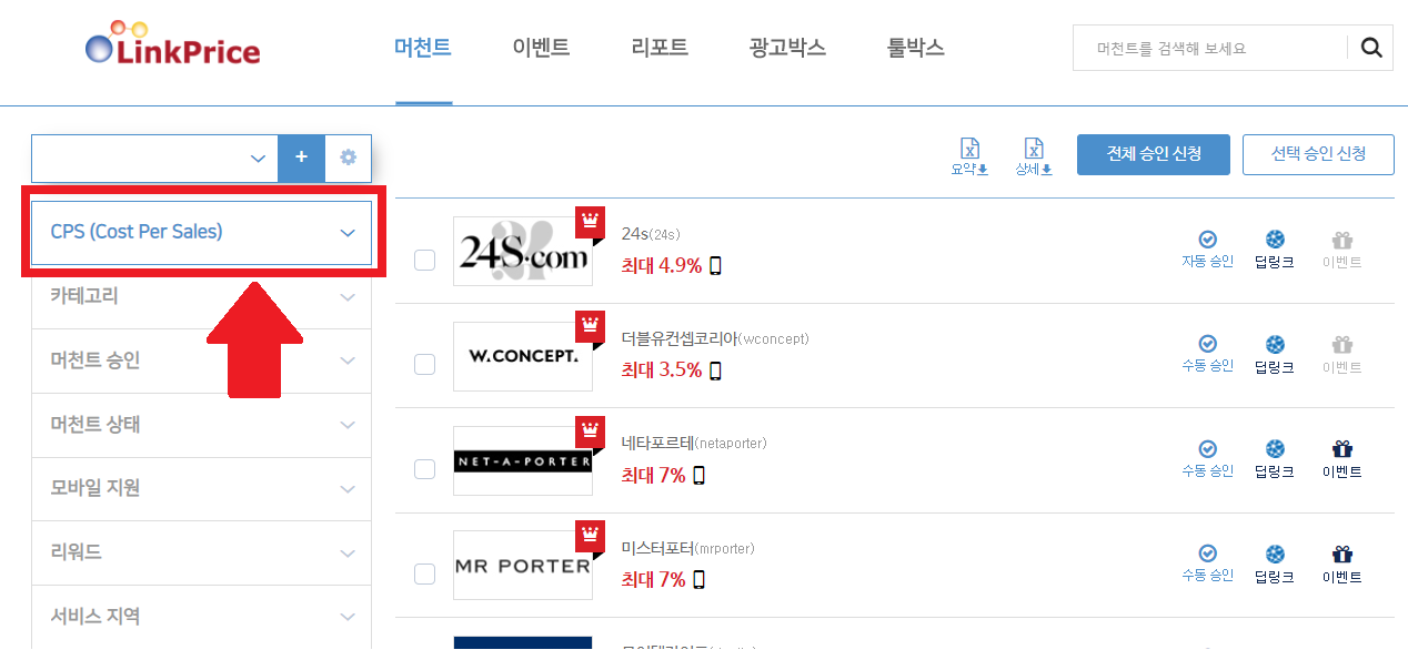 > 머천트 카테고리를 클릭하시게 되면 어떤 유형의 광고링크를 게재할 것인지 선택해야 합니다.