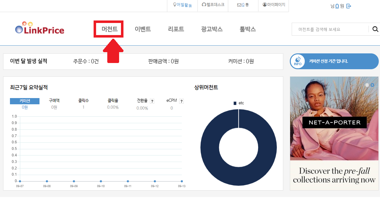 Step 3 . 회원 가입 후 [머천트] 카테고리를 클릭해주세요.