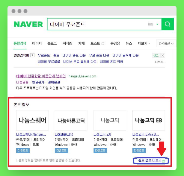 > 빨간박스 모양의 [폰트 정보 더보기]를 클릭하세요.