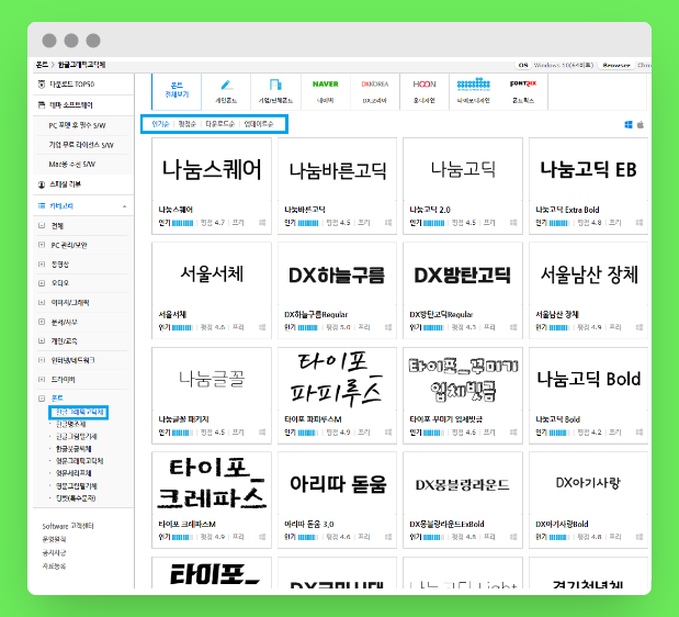 > 인기순 / 평점순 / 다운로드 순 / 업데이트 순에 따라서 글꼴 예시까지 깔끔하게 보여줍니다.