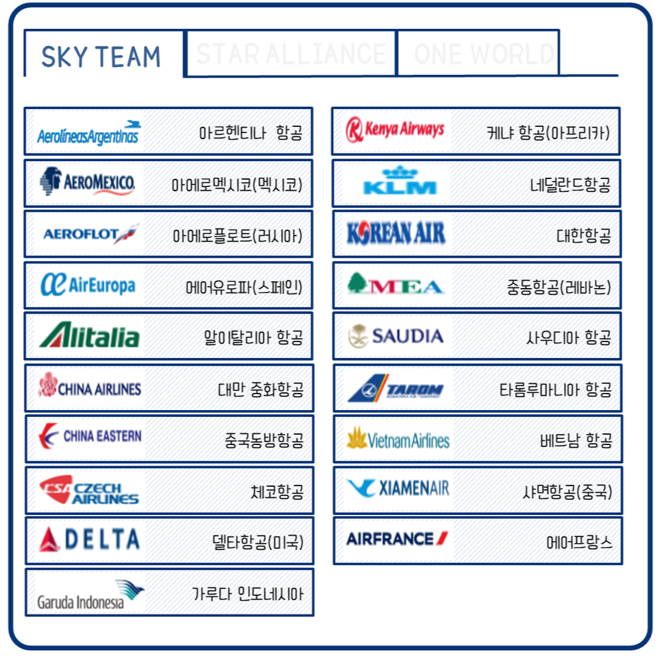 > 전 세계적으로 크게 스카이팀 / 스타얼라이언스 / 원월드 이렇게 3팀이 있습니다.