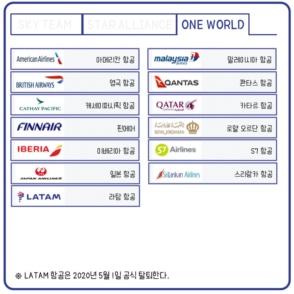 스카이팀은 대한항공, 스타얼라이언스는 아시아나항공이 속해있는데 아쉽게도 원월드에 속해있는 한국 항공사는 없습니다.
