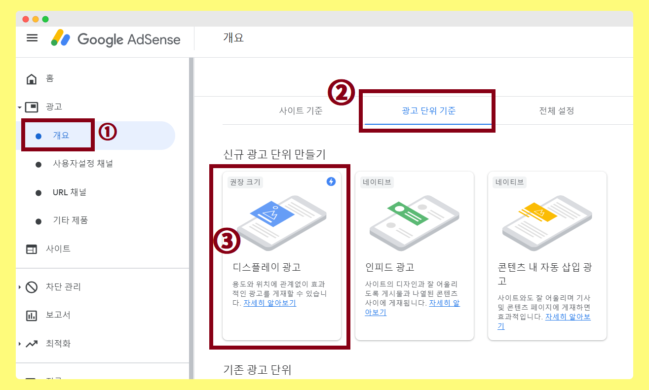 > [광고] - [개요] - [광고 단위 기준] - [디스플레이 광고] 순서대로 눌러주세요.
