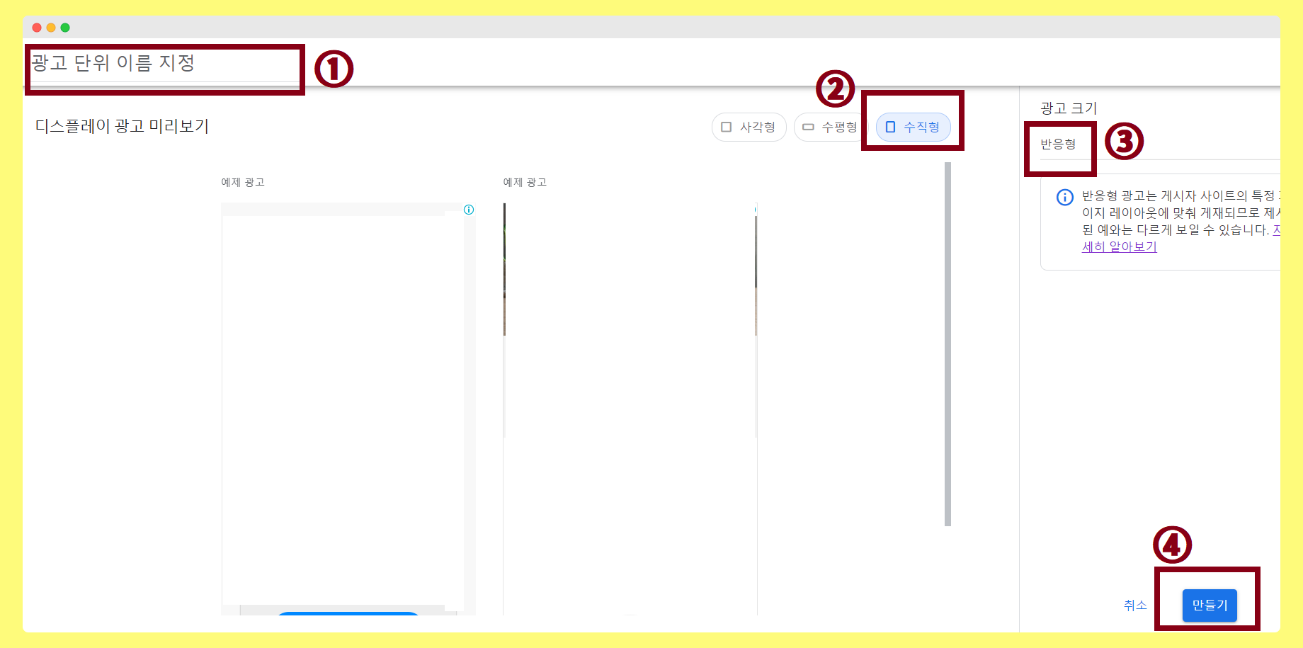 > [광고 단위 이름 지정] : 내가 알아보고 쉽도록 광고의 이름을 지어주시면 됩니다.