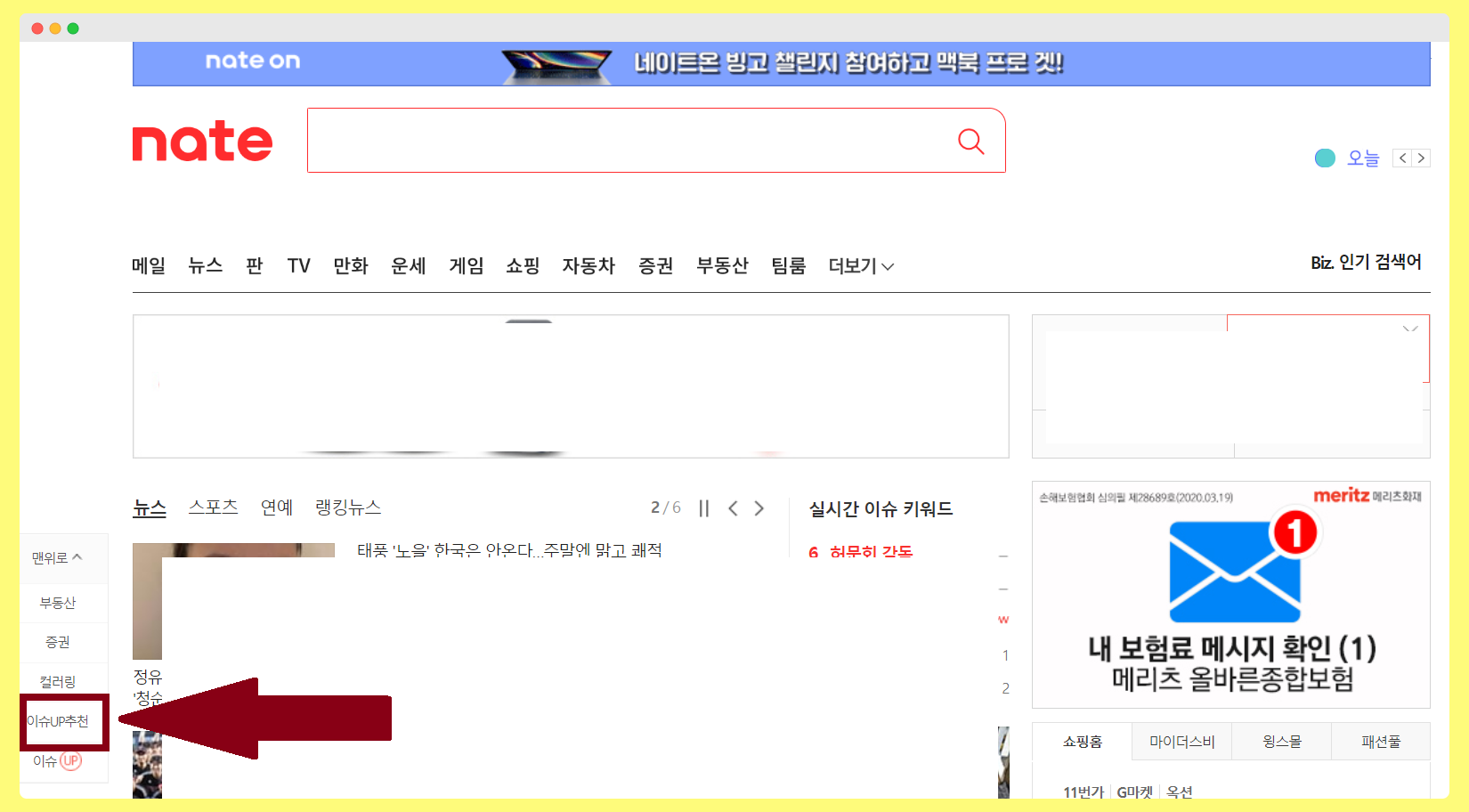 > 네이트 홈페이지에서 좌측에 보면 [이슈 UP추천]이라고 되어있는 카테고리가 있습니다. 클릭해주세요.