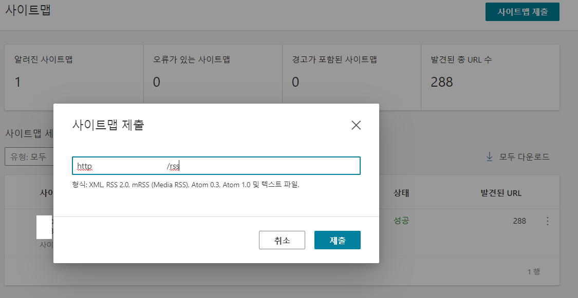> 사이트맵에 본인의 블로그 링크를 등록하시고 맨 마지막에 /rss를 입력 후 [제출]을 클릭해주세요.