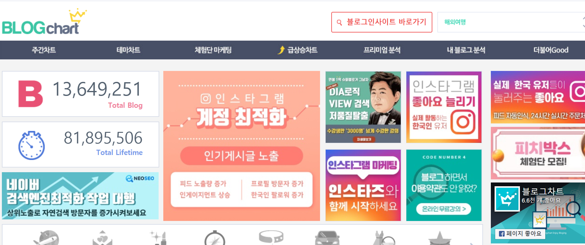 > 또한 주간차트, 테마차트를 통해 블로그 랭킹까지 확인할 수 있다는 점이 좋습니다.