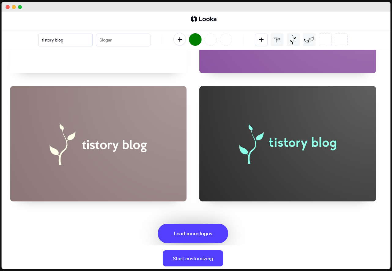 > 저는 초록색 색상과 식물 모양을 선택하였더니 굉장히 자연자연한 로고가 완성되었습니다.