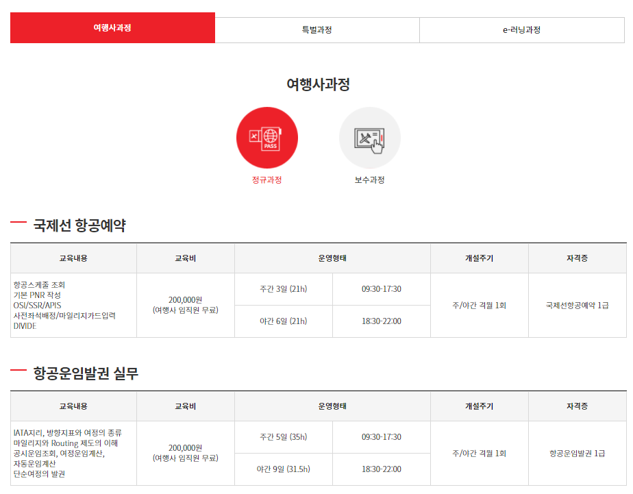 총 3가지 교육과정이 있는데 (1) 여행사 과정 (2) 특별과정 (3) e-러닝 과정이 있습니다.