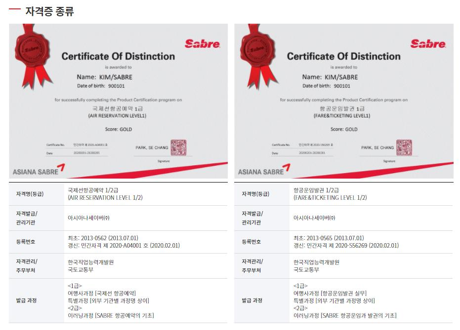 아시아나 세이버는 2013년 7월 1일 자로 항공 예약/발권 2종에 대해 민간자격 등록 후, 민간자격증을 발급하고 있습니다.